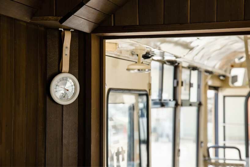 Most of the sauna equipment was made by reusing and remodeling old bus parts. For example, the handrails attached to the seats were wrapped in hemp for a cozier feel, and the lore button doubles as the original ‘get off’ button. The architects also turned the suspension strap into a thermometer and the numbered ticket box into a container for aromatic water.