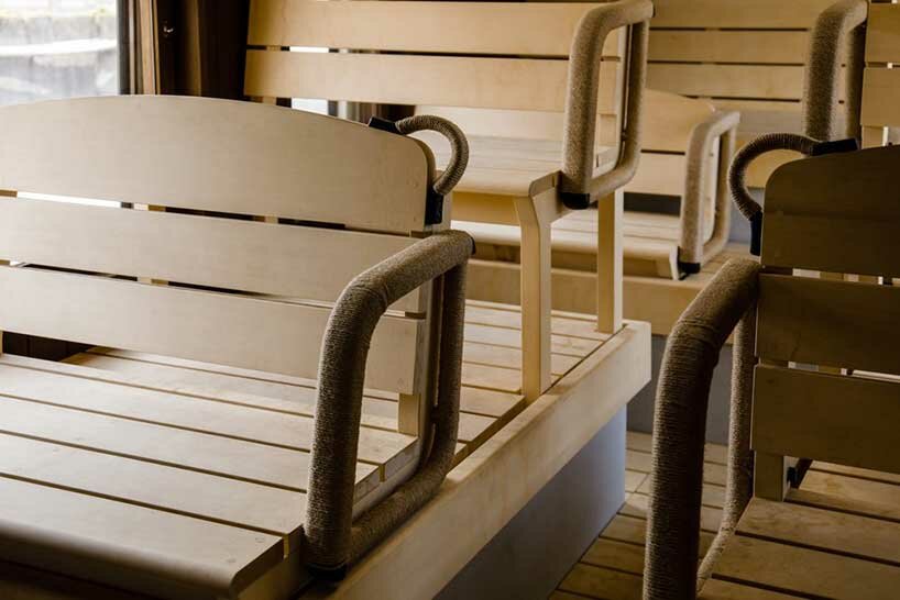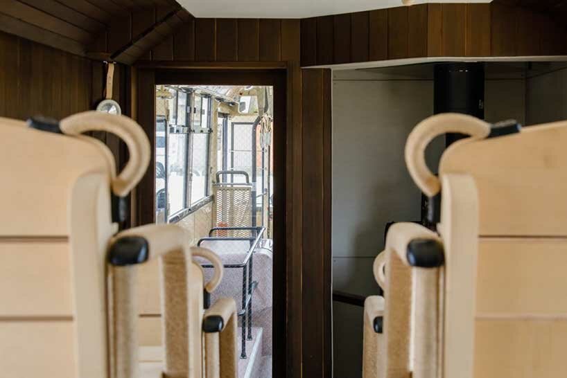 Osaka-based architecture firm OSTR has teamed up with Japanese start-up Sauna Ikitai to transform an old bus into a mobile sauna that travels around Hyogo Prefecture. The vehicle, named ‘Sabus,’ combines the renovated bus and a newly installed bathtub, while the confinement and new layout of the space allow users to choose between different heated areas. Wooden seats and padded benches provide comfort, and large windows help passengers connect with nature while enjoying the wellness benefits of the sauna.