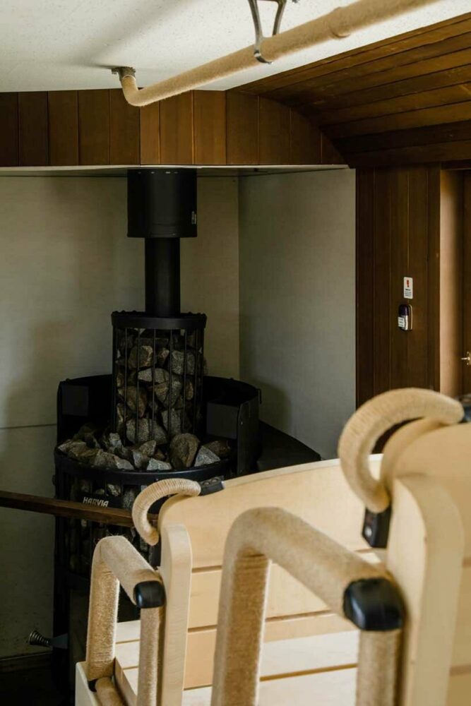 The architects approached the project much like renovating a building, considering the context. The confines of the bus, which would otherwise be perceived as a ‘disadvantage,’ were used for the renovation, allowing a new, multi-level layout to be created in the Sabus. The bus has several levels, each offering different levels of warmth. The first row, where you feel the heat from the stove directly, the second row, which has the highest floor and is closest to the ceiling, and the fourth row, where you can lie down because of the shape of the bench, have the most convection from the ventilation.