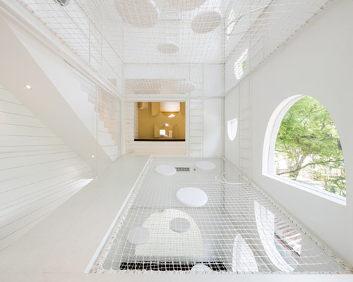 at the heart of the collective’s concern is the linkage of passageways. in response, they have added an extra set of vertical circulation cores to the existing staircases and ramps at the central hallway. using customized nets to build five layers of horizontal planes with different slopes, heights, and sizes, the features act as an extension of the floor plates within the three-storey high living hall. each series has a hole, and each hole is offset from its relative in the level below or above. this emphasizes movement throughout the route as opposed to simply stacking all the voids on top of one another. jumping out of bed and falling down through the cutouts are safe because the kids will be protected by the lower layers of nets. hanging on to them is another technique of playing as the weaves slant down to be grasped by people of varying heights. alternative modes of navigation are supplied by metal ladders that ascend from the ground floor to one of the son’s bedrooms. when looking upward, the mirrored film attached to the ceiling gives the illusion that the players are floating in the air and that the overlapping lattices are higher than they actually are.