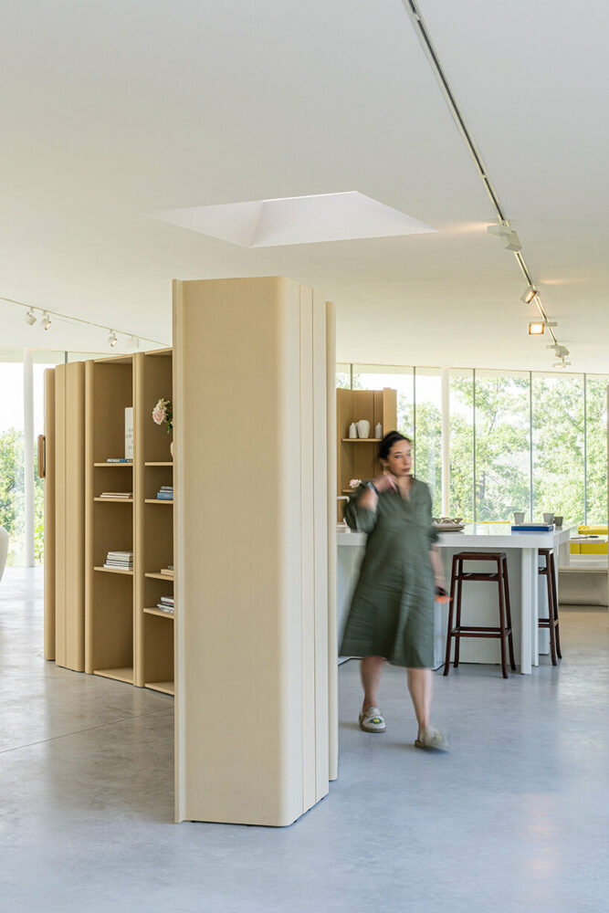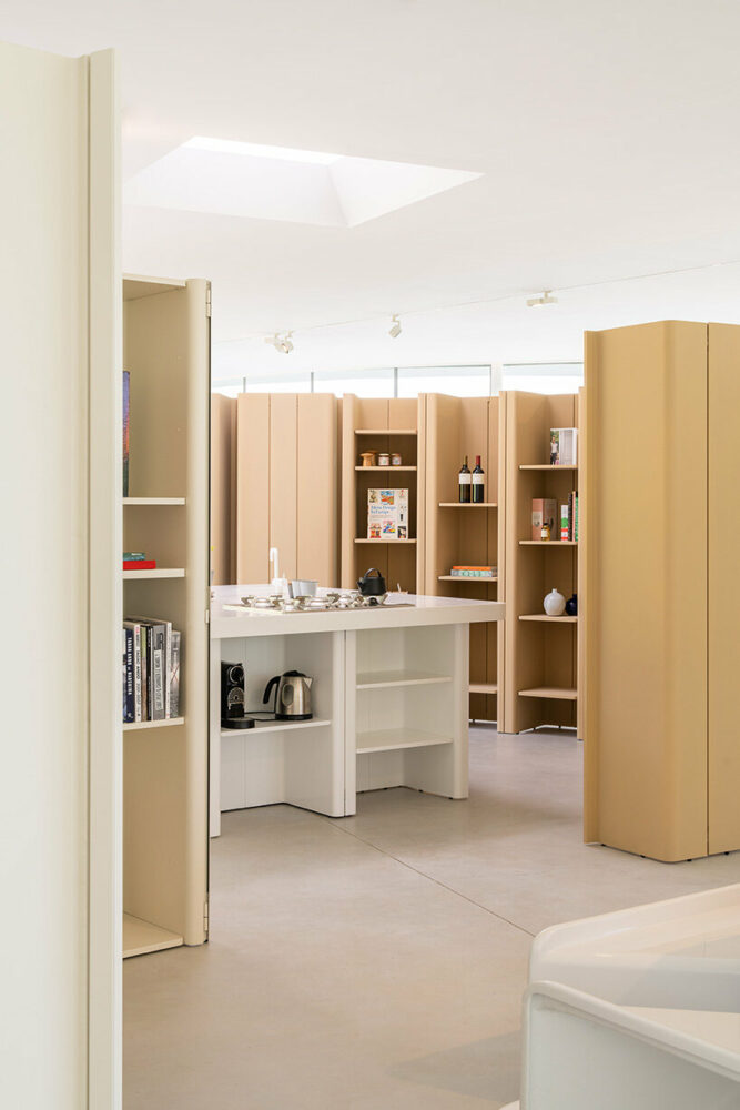 In the Program, users assemble spaces and modules according to their own lifestyle, needs, and psychological ideas about themselves, free from the constraints of typical interior design. The staging is based on the limitless potential of a dual layout based on a perfect grid configuration, where horizontal and vertical elements can be used as floors, seating elements, and storage dividers, allowing infinite combinations of living spaces.