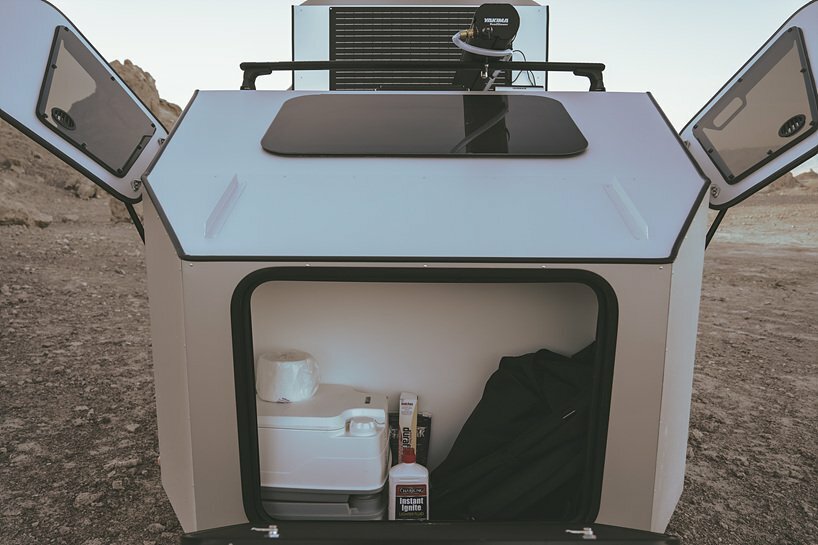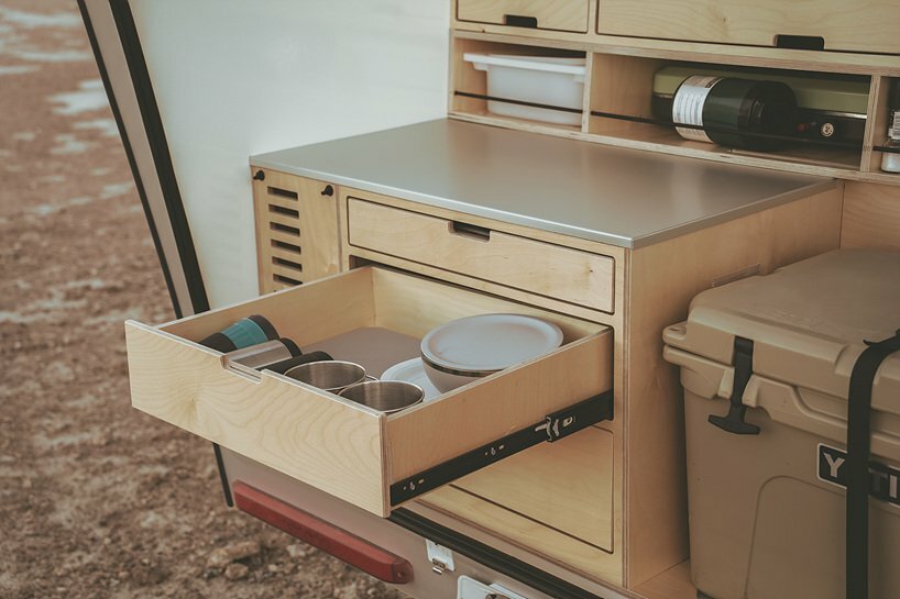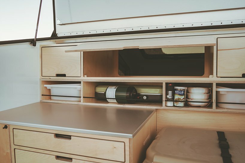 Layout-wise, the P17 holds a 1370mm x 1980mm mattress and a mobile kitchenette at the back. Accompanying the living cabin is plenty of storage space where users can keep their camping gears stowed away tidily. The first section is built at the front, large enough to carry any dirty camping gear, like chairs and tables, and even fit a portable toilet. Meanwhile, the kitchenette offers diverse storage solutions, including the PassThru cabinet. This thoughtful design can be accessed from both cabin and kitchenette, letting people cook outside and easily pass dishes to those staying inside‘, notes the founders.