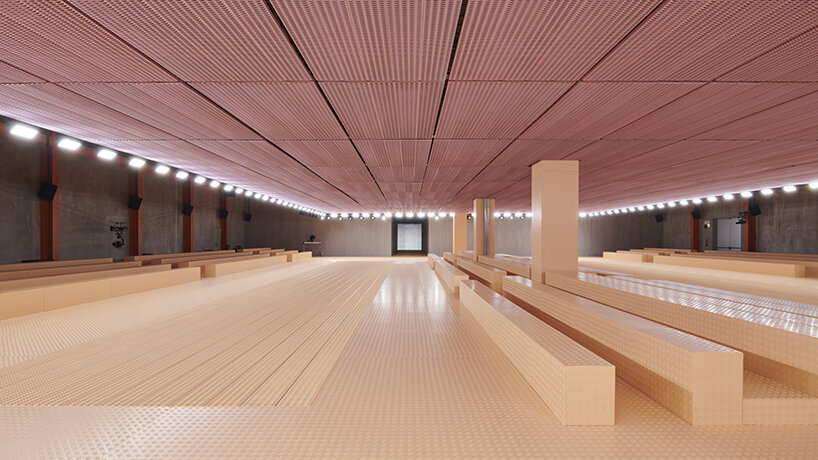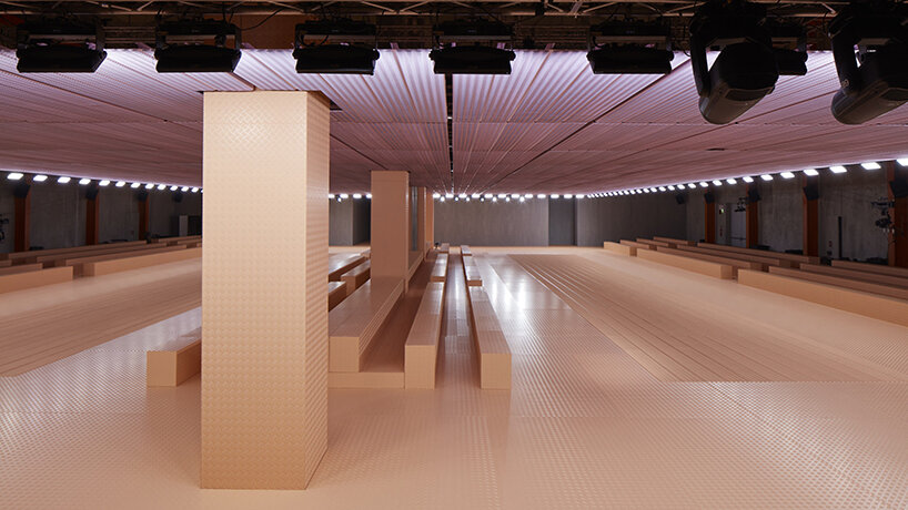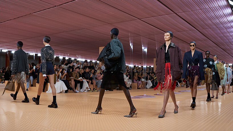terracotta-hued ceiling contrasts the beige floor at Prada’s SS24 Womenswear show | all courtesy Prada