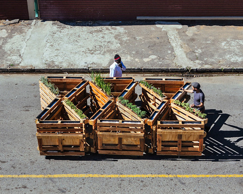 as part of a residence program in the maboneng precinct of downtown johannesburg, local artist r1 aimed to enliven public space and envision innovative solutions that would positively contribute to the community. in collaboration with a local informal upholstery coach maker, he has developed ‘brothers in benches’: a series of 6 interchangeable, mobile seating units made out of reclaimed wooden pallets.