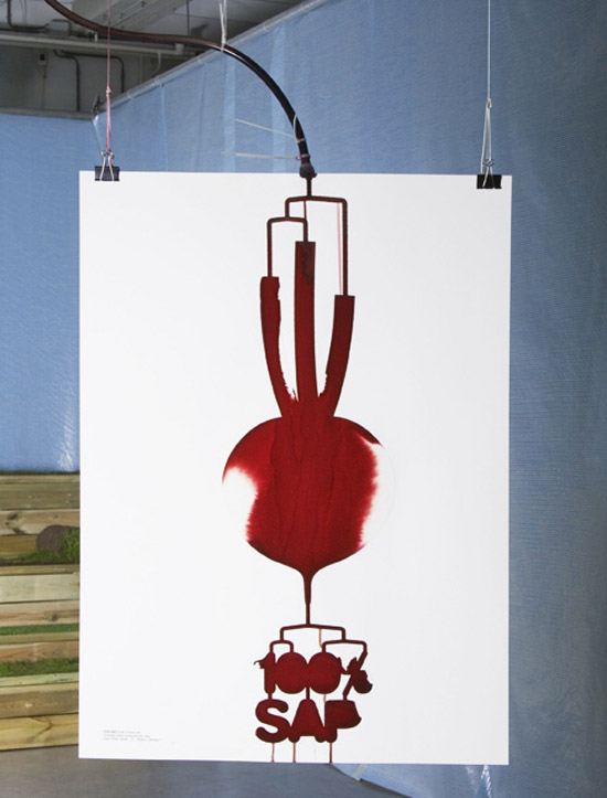 set up consists of a juicer that feeds the underlying funnel and pipe with vegetable juices. the liquids drip further down the paper to create the final design.