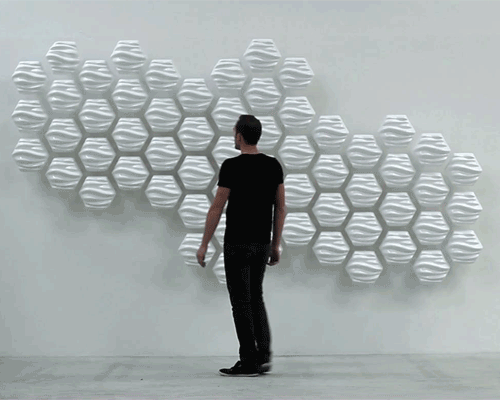 canada-based thibaut sld has designed thehexi’ responsive wall, a series of 60, mounted panels, which react to the movements of nearby people. the graphic designer’s self-initiated project comes as a collision of interaction, geometry and art, as the complex mechanical installation induces an aesthetically engaging result. the hexagonal panels situated on the surface of the interior space use real-time data collected from motion-tracking technology to decode and interpret the gestures and actions of a person within close range. using this feedback, the kinetic wall behaves in sync with the proximate participant; walking passed, jumping near or waving a hand in the direction of the ‘hexi’ wall induces a undulating swell and surge of independent motion. like a vision out of a science fiction film, mesmerizing waves of kinetic flow materialize in a rippling unison, countering the gesture performed by man in close proximity to the installation.