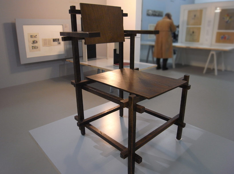 a view into the exhibition, next to rietveld’s chair there are chairs of the same time period by mart stam and marcel breuer. image © designboom
