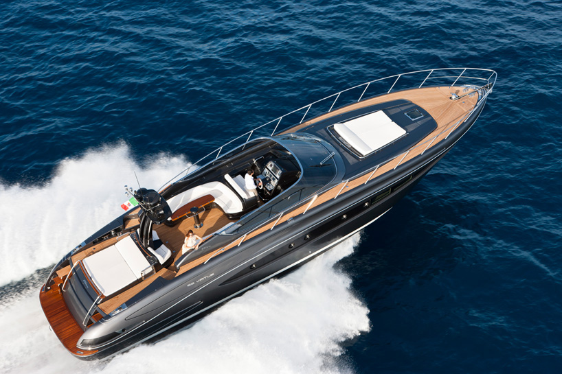 fashioned with a typical mediterranean style, the vessel exudes a sporty look that follows the same lines of the brand’s ’63’ vertigo virtus’. designed to encompass the character of the ‘rivale’, another model of the riva open line, the ‘riva 63′ virtus’ incorporates larger spaces providing a high quality of livability and on board comfort. its sleek profile is emphasized by large arrow-shaped side windows, a specific trademark which has attributed to the success of other riva models, offering a good flow of natural lighting onto the deck below. focusing on offering communal areas throughout, the spacious exterior features two large sundecks, one located at the bow and one astern situated above the garage where the tender is parked. the intention to enhance the social aspects of using the boat is extended into the helm area where the driving seat is a three-seater sofa, giving owners the chance to share the pleasure of driving the yacht with guests. this section is protected by a large windshield with a double curve that gives boaters comfort while cruising on the water.