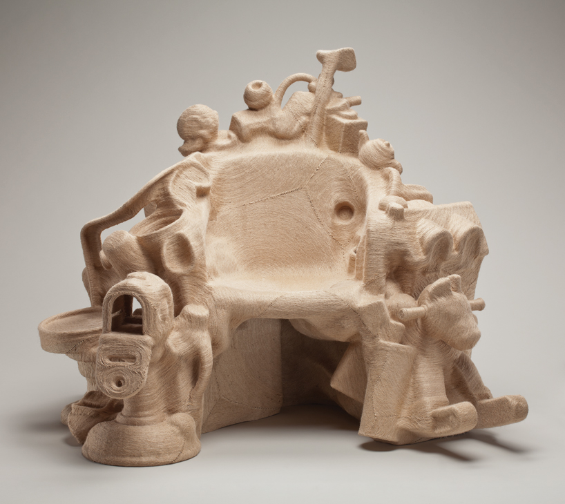‘jute side table’ jute (plant fiber), 12 mundane plastic objects 21″x 20.5″x 21″