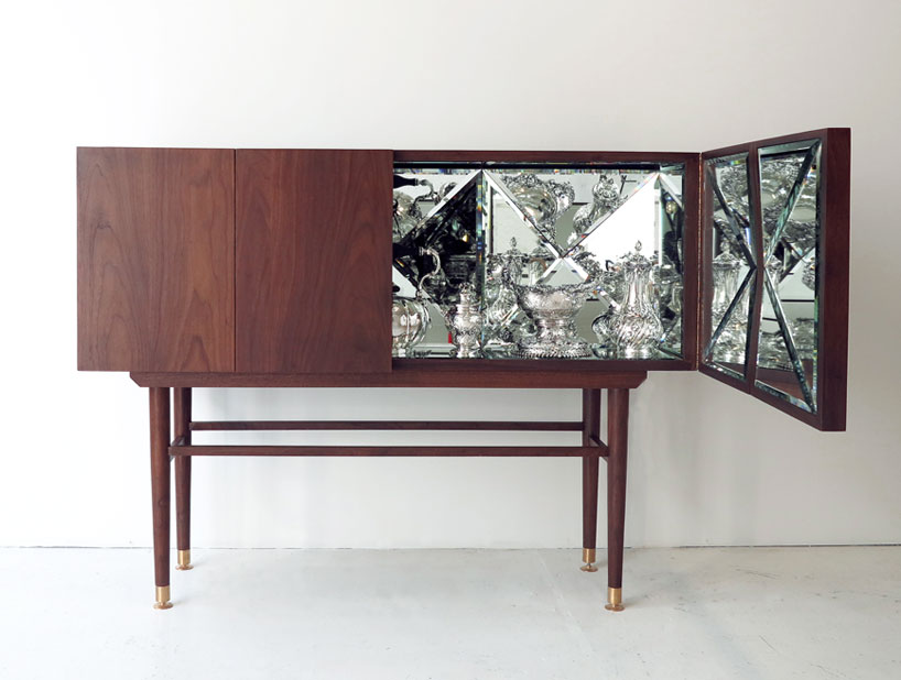 sebastian errazuriz‘s ‘the space between the void’ (the kaleidoscope cabinet) challenges the notions of standard furniture design — that a cabinet should simply be a box with two doors — by hiding luminous mirrors within the interior of the wooden piece. upon opening, the reflections from the shining surfaces produces a kaleidoscopic spectrum of imagery that multiplies the silverware placed inside, painting it with colors and patters. an interior light and a peep hole are built in attributes, allowing a curious viewer to peer in at the infinitely refracted objects, even when its doors are closed and the cabinet is locked. errazuriz’s memories of an old aunt he had while growing up — who always told him to ‘look but never touch’ her precious items — influenced this design. through the small window, the observer is allowed just a glimpse of the belongings within, alluding to the mystery hidden in the forbidden.