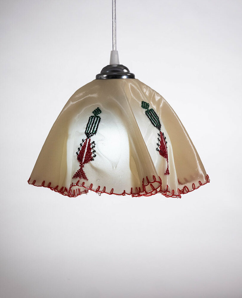 In ‘Satin Sheen’, glass artist Majdi Nadr Ashhab and embroidery artisan Aamal Jamel Hamadeh Sabbah create chandeliers fashioned out of stiffened fabrics that highlight Islamic decorative motifs and the iconography of Palestinian towns and villages. For the ‘Days of Creation’ project, illustrator Naama Lahav and craftswoman Hava Katzcreated created quilt bodies for each of the days of creation in the Book of Genesis. Each body represents a different natural element: light and dark, sea and sky, earth and plants, the heavenly bodies, birds, and fishes – and humans – man and woman.