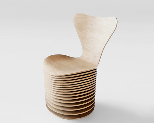 referencing the way that multiple ‘seveners’ can be stacked, BIG’s design focuses on the chair’s materiality, and the essence of the layered veneer. the final result is a subtle repetition of the original design’s formal language, with fifteen layered elements supporting the singular seat and back piece.