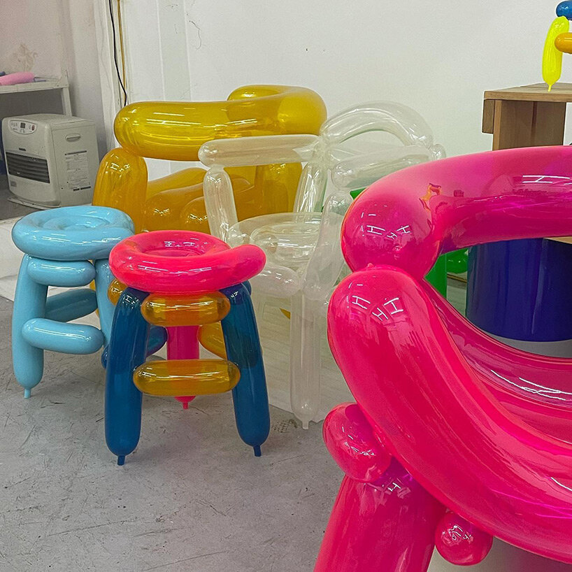 seungjin yang blows candy-colored balloons into solid chairs, stools and benches
