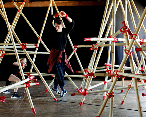 ‘sonic motion’ is an interactive installation of bamboo, rope, and electronics, created by clea jentsch, meret vollenweider, kyungmin han, and christian ferrara. the project was made to participate in soundobject, a collaborative show between students in the experience design and design products programs at RCA, and home sound company sonos. ‘sonic motion’ uses its bamboo structure — and accompanying software — to transmit sound via movement. as people jump, climb, or move through the installation, the bamboo works collectively as an antenna to create a live record of activity, and provide instant sonic feedback.