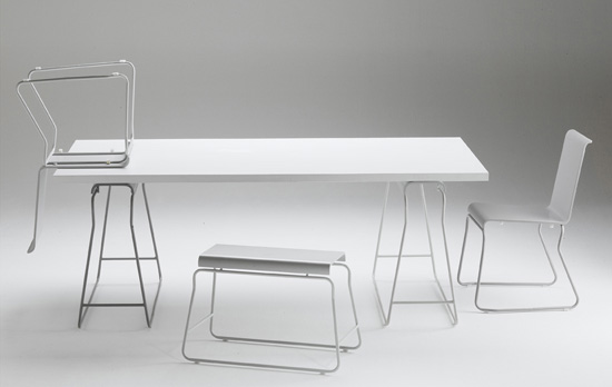 this collection of office furniture by sophie françon and françois mangeol for souvignet design is composed of different typologies of seating and work tables. the furniture was designed for the students of the new building of the school of arts and design of saint-étienne, its modular system allowing for a variety of configurations within the work studio or office space.