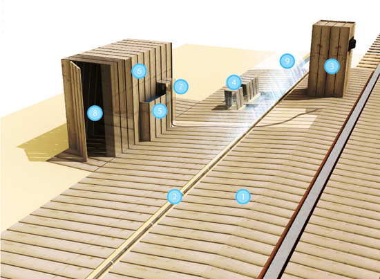 detailed water distribution unit 1. wooden unit 2. opening for maintenance 3. car tire 4. electrical dynamo 5. steel tube 6. water pump 7. hose connecting pump and tube 8. railroad