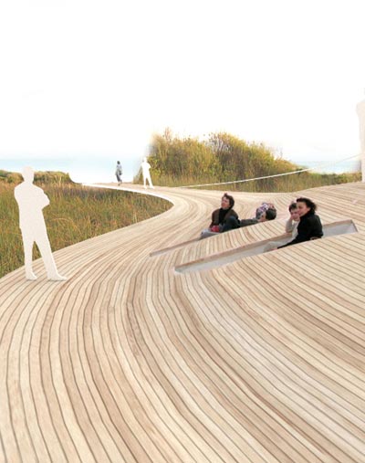 left: existing path. the restoration of the existing path will be done by users meandering through the area. right: new path. with a few viewing platforms along this new route, this will help to generate a more intense experience of nature. these viewing platforms allow users to take a moment of rest.