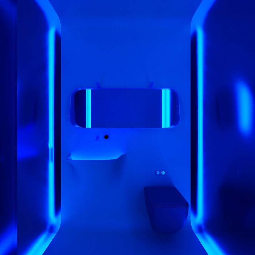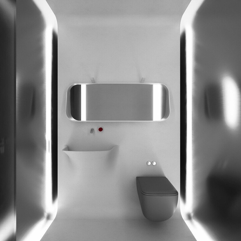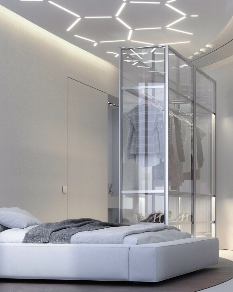more secluded rooms of the house are animated with reflective elements like freestanding glass wardrobes and two stainless steel walls in the guest bathroom accentuating the RGB lighting. stipfold reiterated stainless steel in the kitchen, which can be partitioned from the living room with a sliding door, leaving only a decorative kitchen island exposed. four core silhouettes are present throughout the apartment ceilings and the parqueted areas of the floors. these shapes are distilled from the hand-sketched outlines, adding a human touch to the futuristic forms. wooden floor zones and custom white forms on the ceilings are the cozy blips in the large monochrome surface areas.