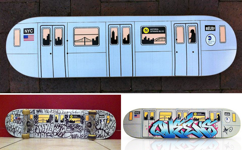 the subway skate deck by belief looks like a new york city subway car, it’s sold together with a marker and stickers so you can add your own graffiti.
