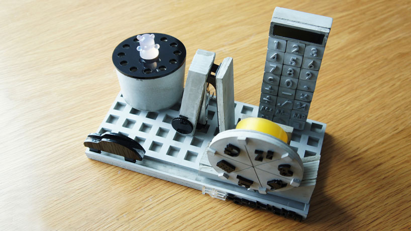 the series of interactive concrete objects includes a calculator, pen holder, stapler and tape dispenser