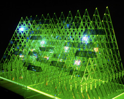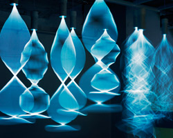 the lights of each orb run through an animated sequence when a viewer steps beneath, casting patterns on the floor