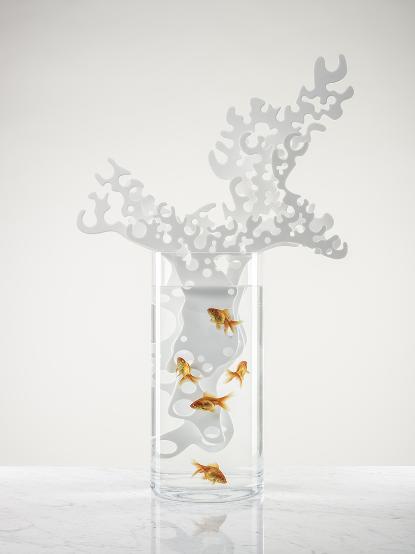 also significant, is the third-annual partnership between the school and DuPont™ Corian®. design and technical specialists worked closely with design professor marco borraccino to teach pupils the potential of the material. three original projects in the exhibition are a direct of the workshop which successfully enabled designers to push the limits of their work and Corian® alike