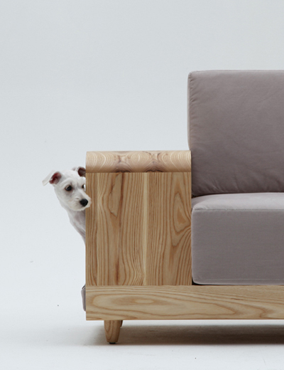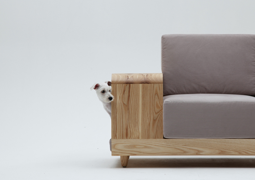 ‘the dog house sofa’ by korean designer seungji mun was conceived as m.pup‘s first line of pet furniture. as numbers of nuclear families are increasing, animals coexisting with people are establishing themselves as companions for everyday life. the furniture collection becomes a tool for interacting between humans and animals as residential spaces are becoming increasingly shared with household pets. composed of the solid ash and canvas fabric, the sofa combines a dog house into a delivery of new communal spaces for both owner and man’s best friend.