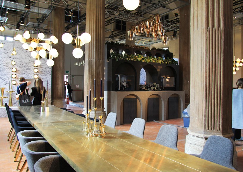 the four programs will operate as a restaurant all through the design week with the dishes created using electrolux grand cuisine appliances; the world’s first professional cooking system designed for the home. starting with the ‘air kitchen’, food is explored with techniques such as vacuuming, with the element of air demonstrated in all aspects: such as the lighting, surfaces, with thin, vertically-placed caesarstone slabs and cut-outs serving as cooking counters. meanwhile, the ‘earth kitchen’ is an exercise of the earthy nature of cooking. the conceptual kitchen incorporates brown tones of selected caesarstone designs including light mushroom colored tuscan dawn and concetto albero, made from assembled segments of petrified wood, vegetables grow out from the sculptural surfaces, with the arches mimicking that of the interior of the besana itself.