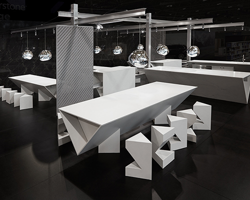 at the interior design show (IDS) in toronto, caesarstone — the leading manufacturer of premium quartz surfaces — presents the ‘ICE’ kitchen installation by tom dixon. the first installment of caesarstone’s year-long collaboration with dixon for 2016 sees a series of monolithic triangular prisms in various volumes and heights form the base of the kitchen, creating a food prep area, serving stations, surfaces and stools. ‘ICE’ references canada’s frozen lakes and the icebreakers that clear the way for freighters during the winter, which leave behind a frozen trail of jagged pieces in a spectrum of white and grey hues. an aluminium extrusion system developed for flat pack housing is used as a secondary material, delivering a cold, industrial aesthetic while simultaneously acting as the structural support and lighting rig, where dixon’s mirrored ‘melt’ lights complement the theme. the toronto ‘ICE’ installation is the first of four semi-professional kitchens that reference the elements of ice, fire, earth and air, the next of which will be revealed at milan design week 2016.