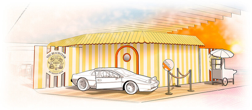 last but not least, auer’s own white lotus, like the one of james bond in the spy who loved me (1977), is parked in front of the club, welcoming visitors. from the car to the lifeguard chair and the diving pontoon, nothing has been left out.
