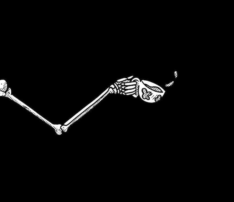 as for the packaging, tuuli and sophie worked with creative branding director warren beeby to bring their ethos to life. he says: ‘the identity was inspired by tuuli’s skeleton obsession, vintage club badges, and tattoo flash sheets. we focused on bringing the blends to life by creating a different skeleton character with illustrator tommy spencer. each skeleton brings dark humor to the ups and downs of everyday life.’