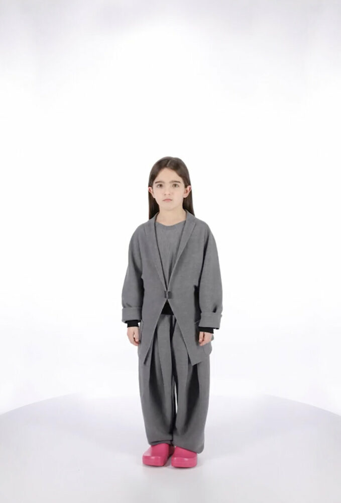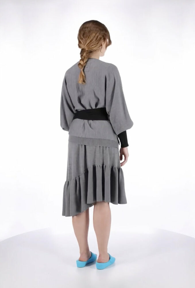 On the other hand, the ‘elegant and extremely comfortable trousers, [are] characterized by a black elastic waistband with a high waist and wide pleats on the front. Equipped with American pockets, it has a loose and soft fit, with a slight narrowing at the bottom of the leg.’ Finally, the ‘wide asymmetrical skirt [offers] a pleasant feeling of airiness and lightness.’