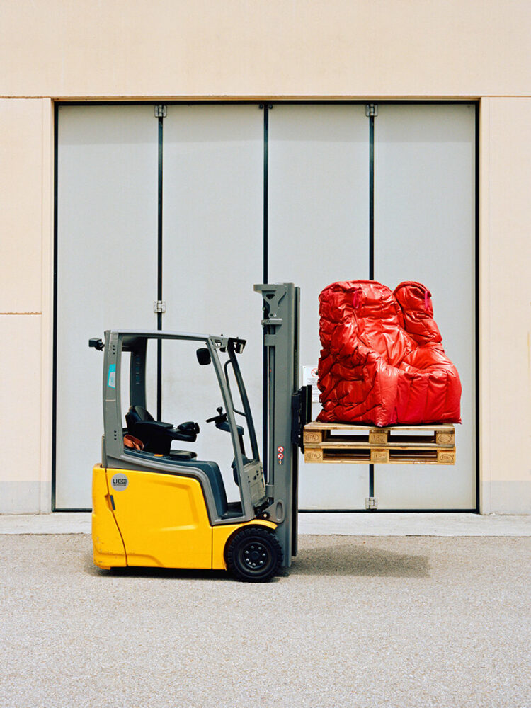 The Italian Radical Design Group (see more here) conceptualized the photographic campaign as a fresh start for Meritalia (and more here). Moving trucks, boxes, upholstery foam roll, and nylon covers set the scene for an ‘unpacking’ atmosphere. Shots of people carrying the furniture and taking the covers off of them symbolize a kind of rebirth. Throughout most shots, the ‘manufacturing’ backdrop is tinged with the vivid color palette of Meritalia products — blending shades of red, blue, yellow, and green.