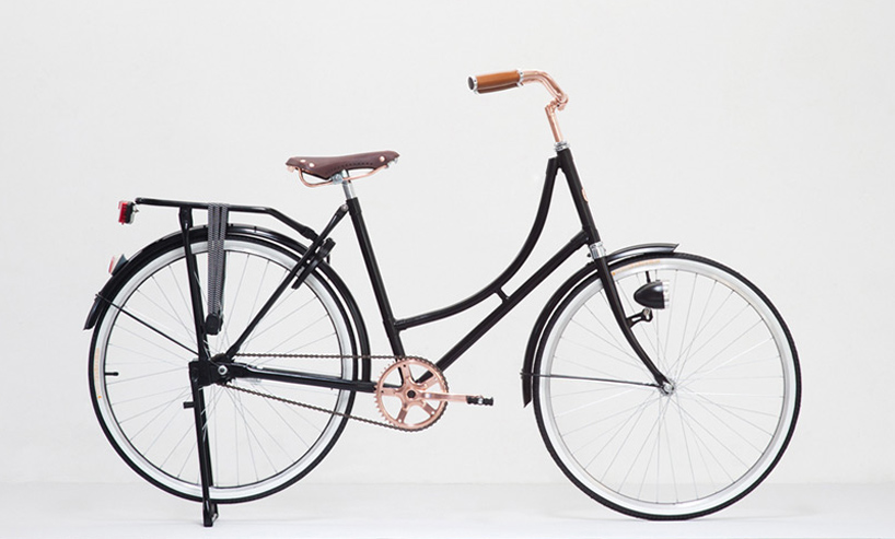 ‘U bicycle’, a hand sculptured art object is made by singapore bikesmiths vanguard is available at tokyo-based CIBONE. produced for underscore magazine (with branding and design by HJGHER), it was first shown at designtide during the last tokyo designers’ week. the ‘U bicycle’ evokes a nostalgic memory of the classic dutch style, with a black matte steel frame (made in japan) in combination with copper details and a leather saddle.