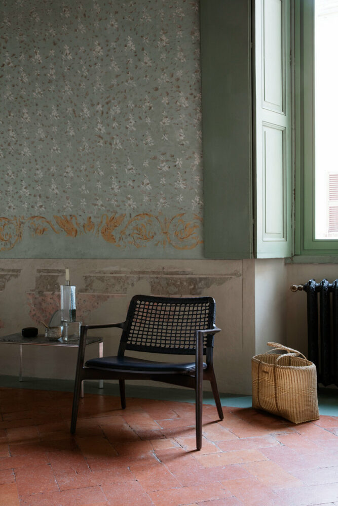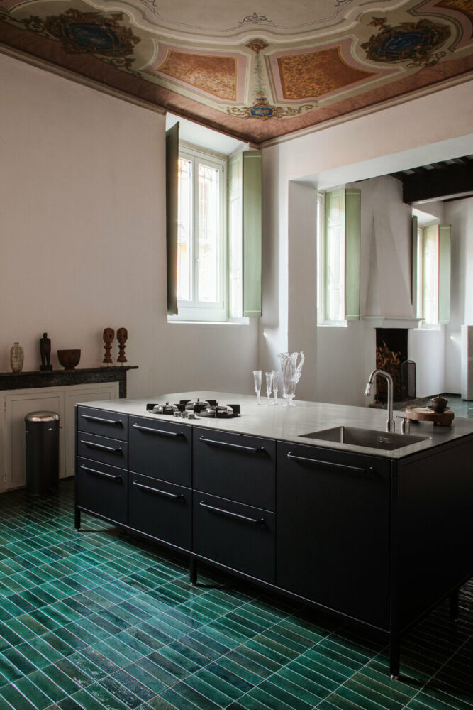 Here, in the so-called piano nobile (hosting floor), a modular kitchen island from Vipp in matte black commands attention in an intriguing dialogue between modern industrial design beneath a loft of ancient Venetian frescoes and above a tiled floor made of hand-made jade tiles from the local area. Green accents are frequently used, recalling the 1600s interior design of the area.