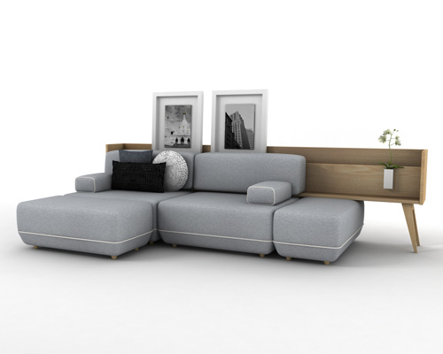 estudio vitale brings together practicality and versatility in the form of ‘TWO BE’, a hybrid sofa and storage / display piece. developed for spanish manufacturer KOO international, a structural wooden framework equipped with shelving and pocket areas for magazines and books, serves as a support for upholstered modules (seat and backrest components) which can be reconfigured in a range of ways, depending on the user’s needs.
