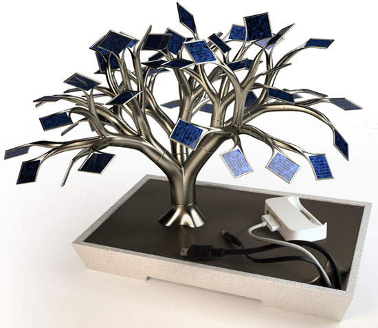 is a metalic bonsai tree – that uses photovoltaic panels to charge mobile devices such as cell phones, MP3 players, digital cameras etc. the modular nature of the design allows the user to model the tree as they prefer.