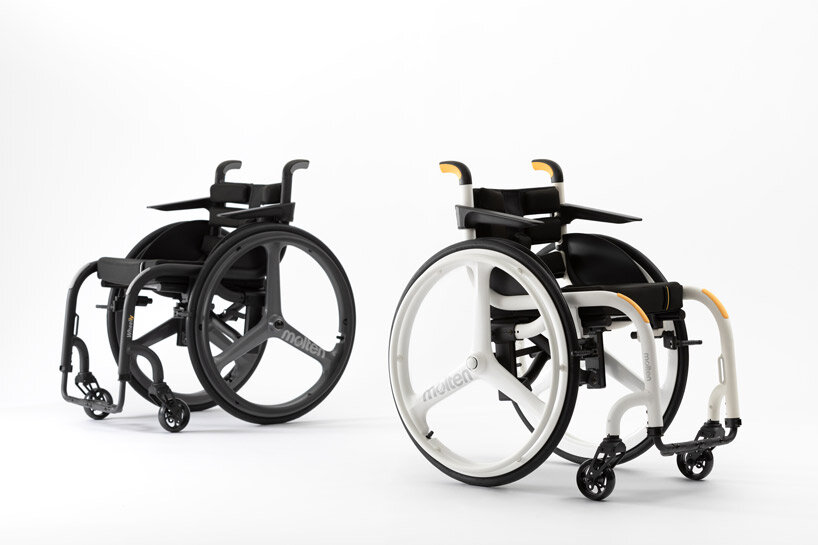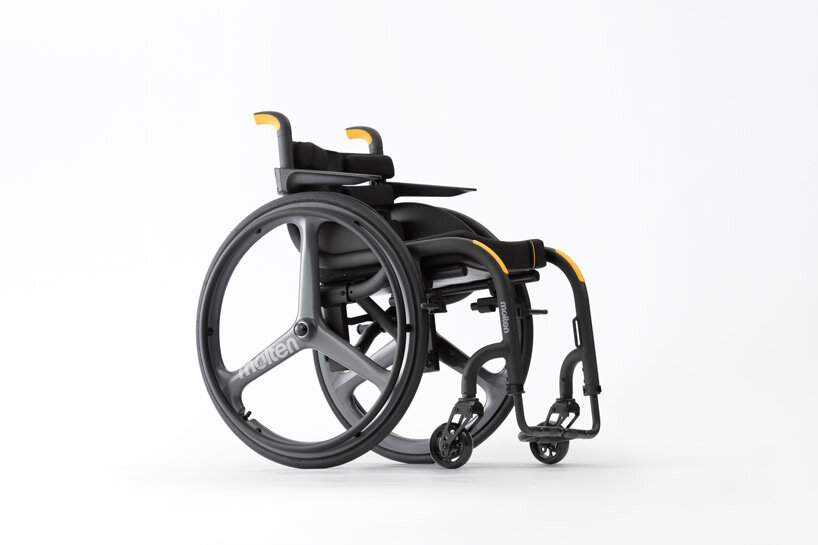 tokyo-based studio quantum has designed a sleek, foldable wheelchair that aims to promote user wellbeing while also affording support from others. developed in collaboration with medical equipment manufacturer molten, ‘wheeliy’ features yellow accents to make lifting the chair more intuitive; people unfamiliar with wheelchairs already know where to put their hands to either lift or fold the product.