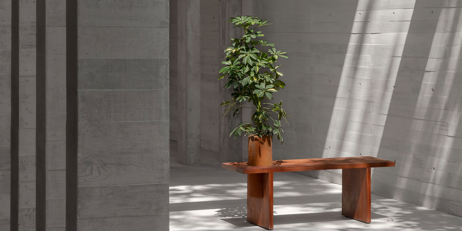 Banca Tres combines wood craftsmanship with living elements. Constructed from tzalam wood (120 × 40 × 44 cm), its surface incorporates a circular opening (18 cm in diameter, 25 cm deep) designed to hold a clay planter (17 × 55 cm). The integrated planting element transforms the bench into an evolving object that changes over time, linking furniture with natural growth.