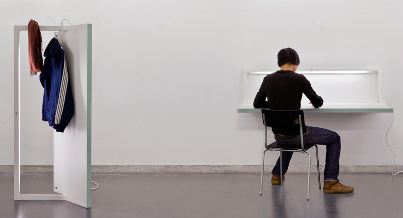 yi-cong hooks the panel to the wall for use as a table image © designboom