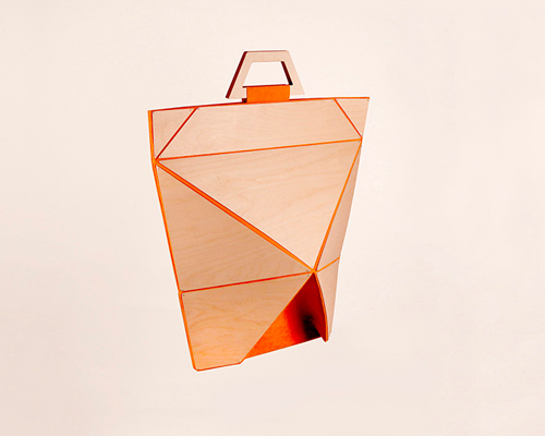 the ‘facet’ line of bags by maryland-based designer yingxi zhou consist of angular structures that are influenced by origami forms. the malleable shapes are made from maple veneers and fabrics to create a series that is well-suited for storage and shipping when folded, and serve as a useful geometric container when not. each of the pieces from the range can be broken down to lie flat, and the fashion accessories are also available in a variety of different colors and sizes.