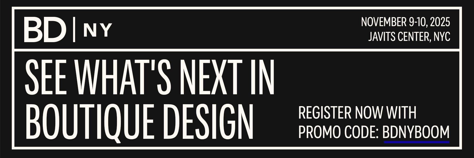 BDNY is where boutique hospitality design meets its moment. Discover innovative furniture, lighting, and textiles, as well as striking surfaces and the latest tech—all handpicked for visionaries like you. Wander through immersive Designed Spaces and feel the pulse of the industry as you connect with designers, architects, hoteliers, and purchasing leaders. Earn CEUs in expert-led sessions that inspire new ideas. And don’t miss the all-new Dine + Design pavilion, where front-of-house creativity takes center stage. BDNY is held at the Javits Center in New York City on November 9-10, 2025.