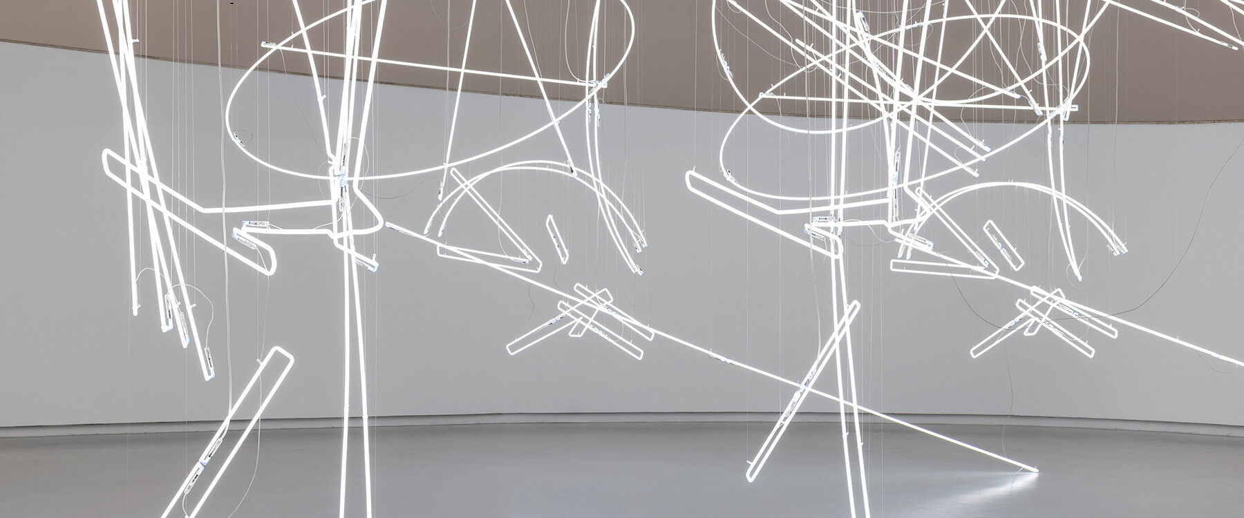 Forms in Space… by Light (in Time) presents a monumental installation by Cerith Wyn Evans, composed of an intricate network of white neon suspended in the Oval Gallery. The work unfolds as both sculpture and choreography of light, tracing rhythm and motion through space.