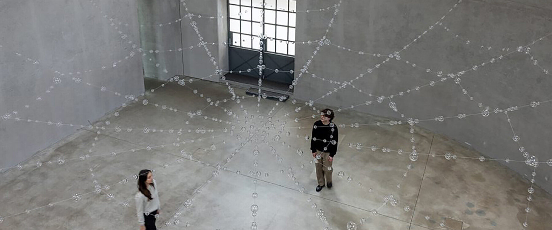 Mona Hatoum brings a constellation of hand-blown glass spheres and a motorized metal tower sculpture to her exhibition at Fondazione Prada in Milan. Named ‘Over, under, and in between,’ the site-specific project is divided into three parts comprising a web, a map, and a grid.