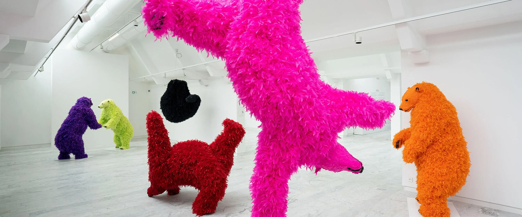 The exhibition features new commissions, including a giant inflatable comic cell made with Big Nate creator Lincoln Peirce, three new polar bears, and a rooftop installation of suspended trays filled with colored liquid that play with light and space. Pivi blends joy with reflection, and invites viewers to experience art as a space of connection and wonder.