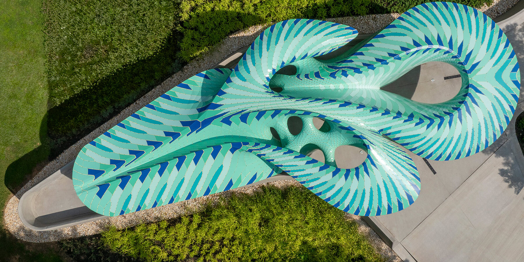 shimmering chain links reinterpret the pun-lom, a carved wooden gable board found on thai homes.