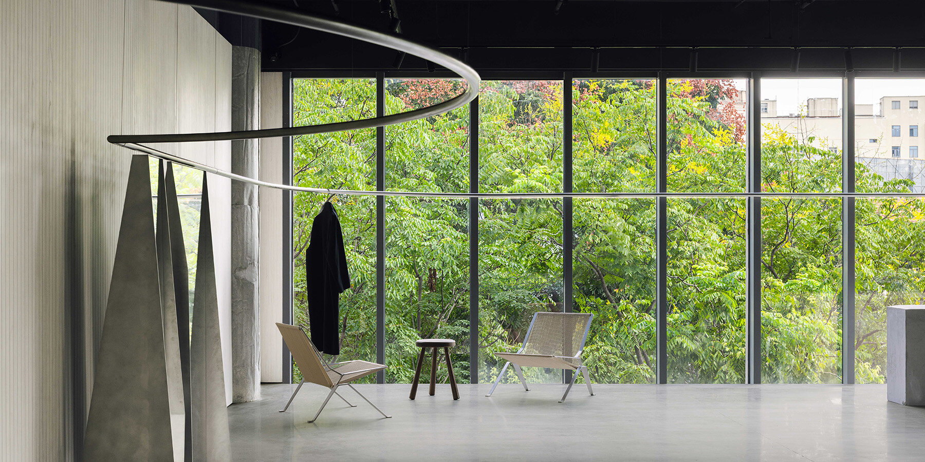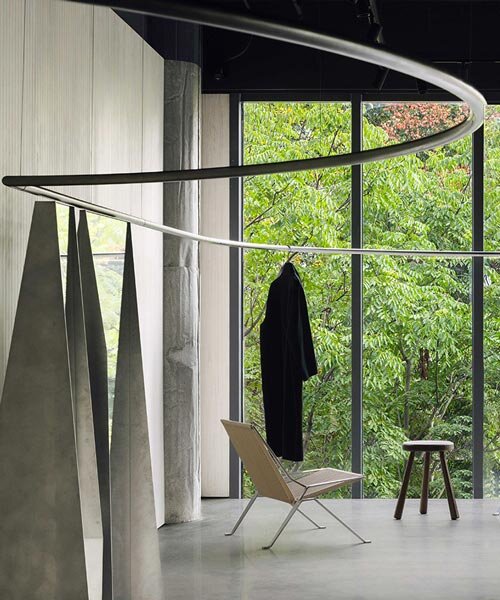 continuous steel rail traces shanghai showroom’s sculptural interior, like a freehand drawing
