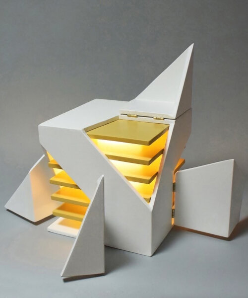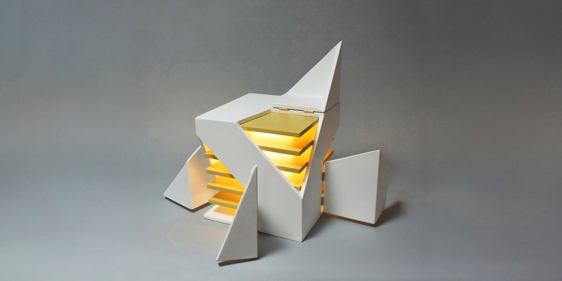 interactive foldable cube lamp swings open and emits warm light from multiple corners