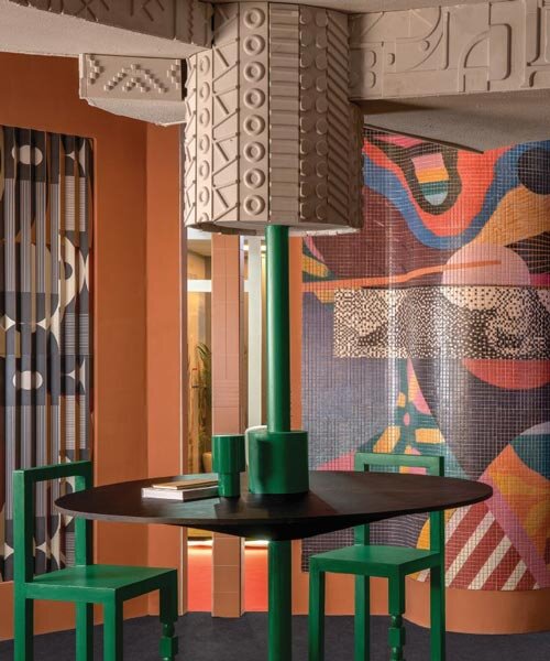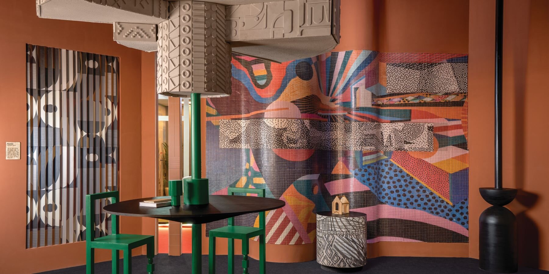 patterned tiles extend from curved walls to furniture in layered retail exhibition booth