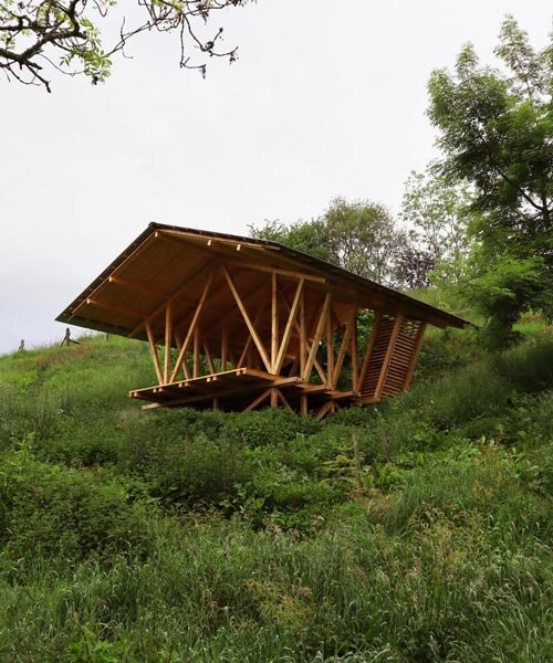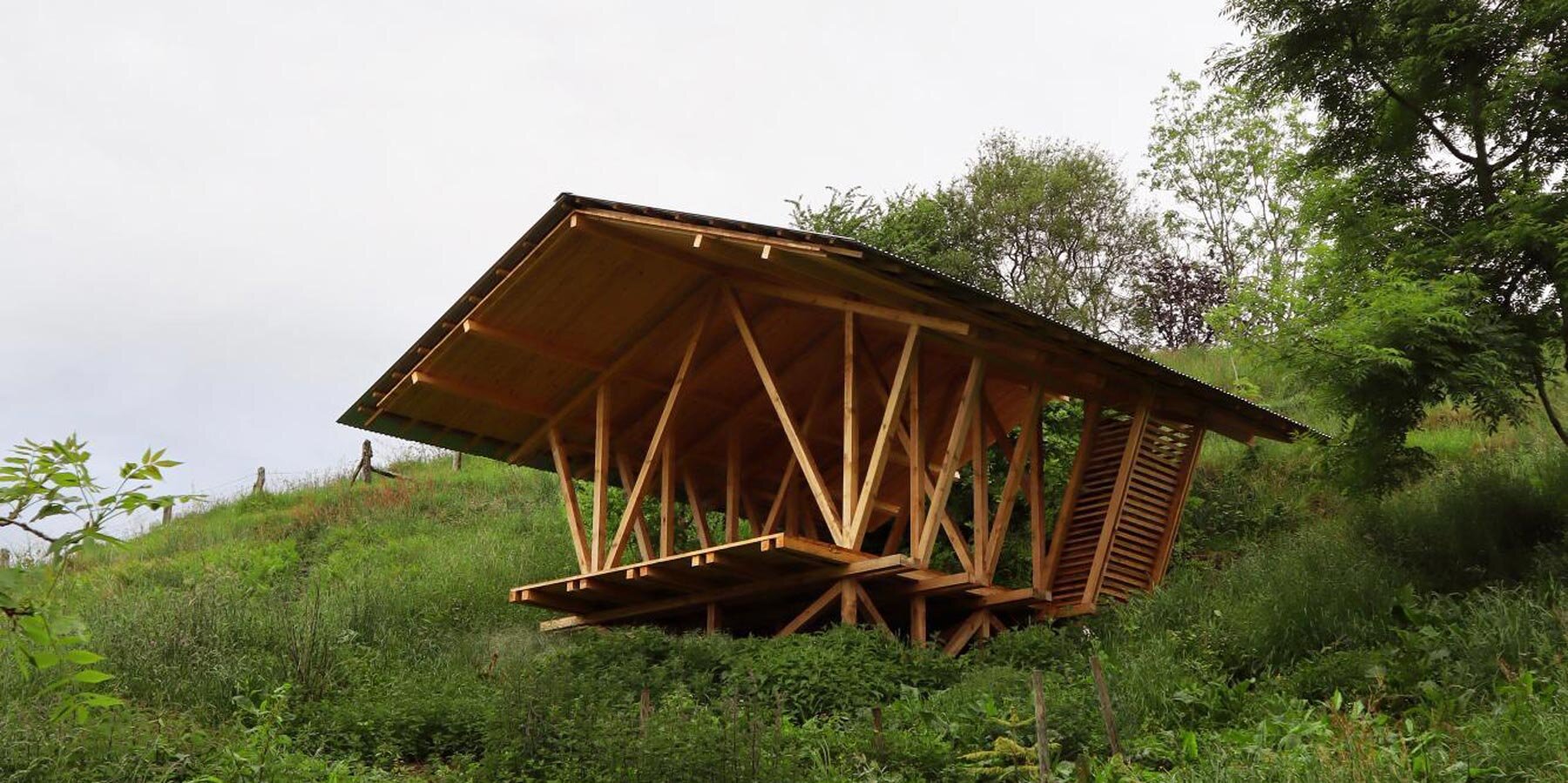 gabled timber observation pavilion promotes agroforestry in asturias, spain